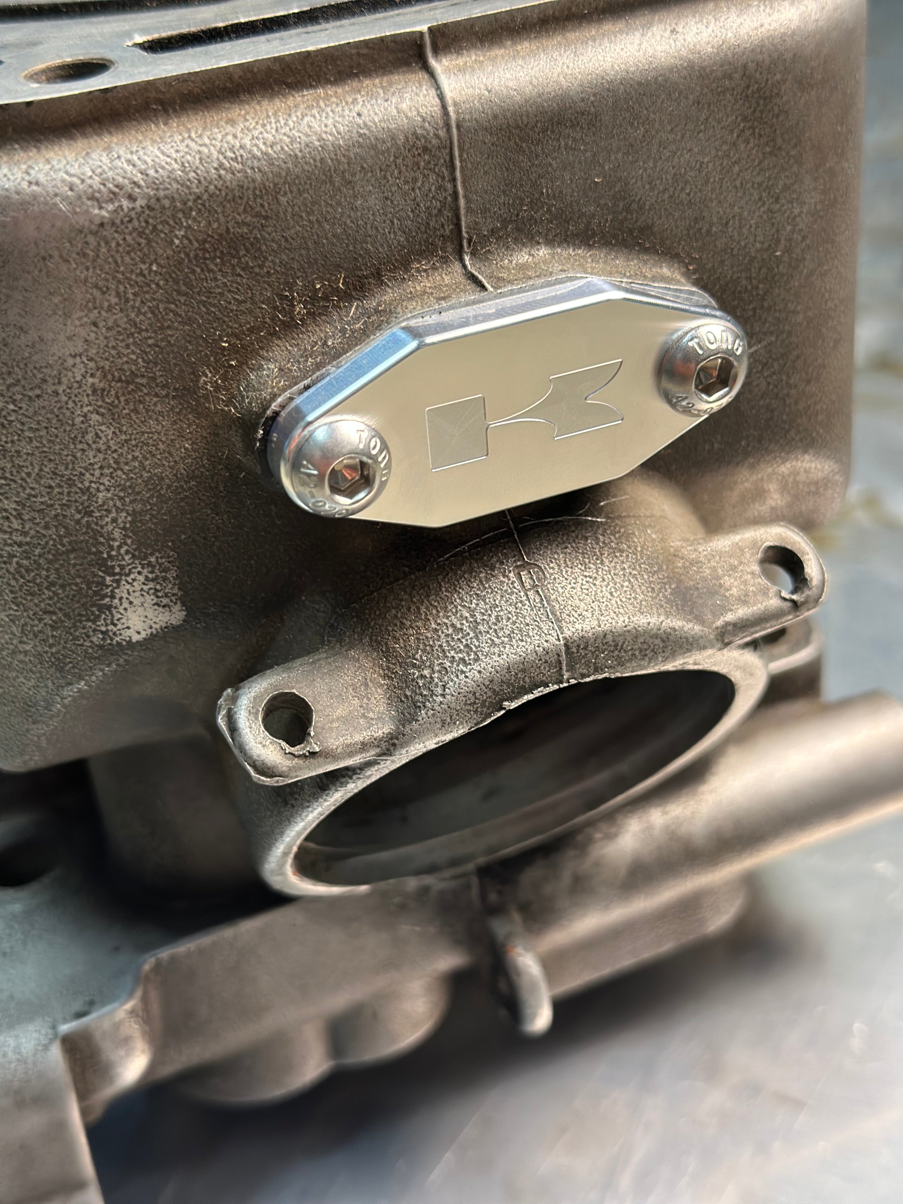 This is a direct replacement for the Kawasaki KX500 center power valve cover (OEM part #14024-1588). While the original part is a basic aluminum casting, this version is CNC-machined from a solid block of 6061-T6 aluminum for a much cleaner, sharper appearance.
